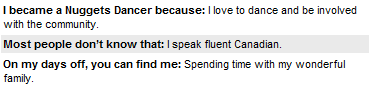 A friend of mine sent me this interesting link to the profile of a girl who’s on the Denver Nuggets dance team who carries the rare talent of “speaking fluent Canadian.” Last time I checked, Canadians spoke English (or for those in Quebec, French). Sure, we spell some words differently, but it’s still the same language. Not sure if she’s really proud of it or someone goofed up on the team’s website.