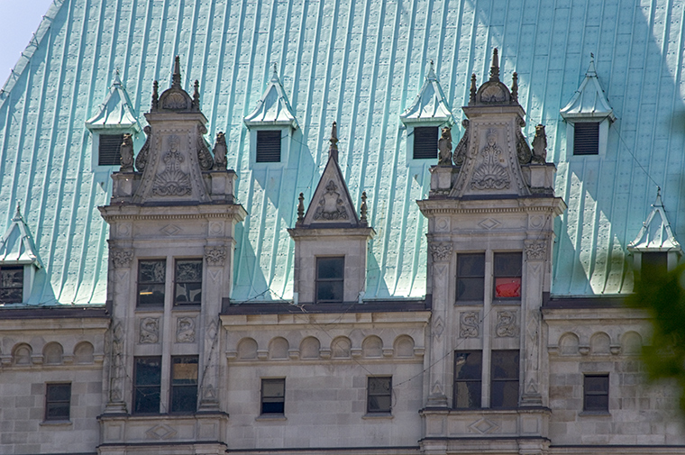 A broken window with red tarp in the Hotel Vancouver as seen looking south from Burrard Street.
